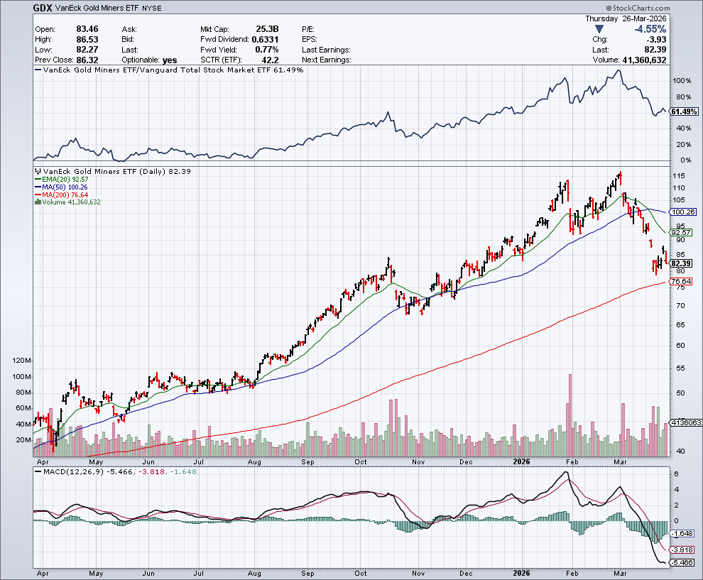 Grafiek: evolutie Van Eck Gold Miners index (GDX) op 12 maanden (Stockcharts)